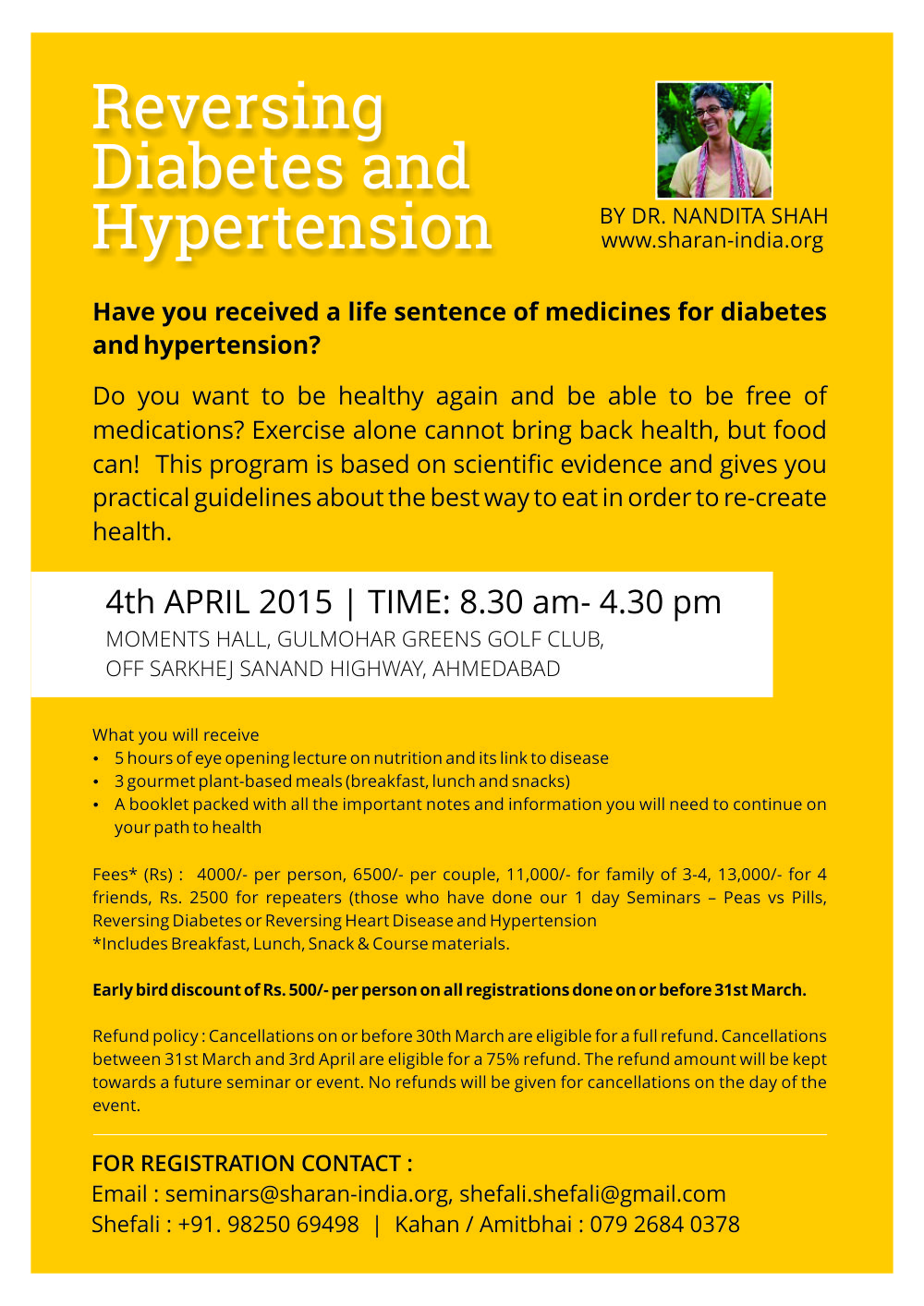 Contribution* (Rs): 4000/- per person, 6500/- per couple, 11,000/- for family of 3-4, 13,000/- for 4 friends, Rs. 2500 for repeaters (those who have done our 1 day Seminars – Peas vs Pills, Reversing Diabetes or Reversing Heart Disease and Hypertension